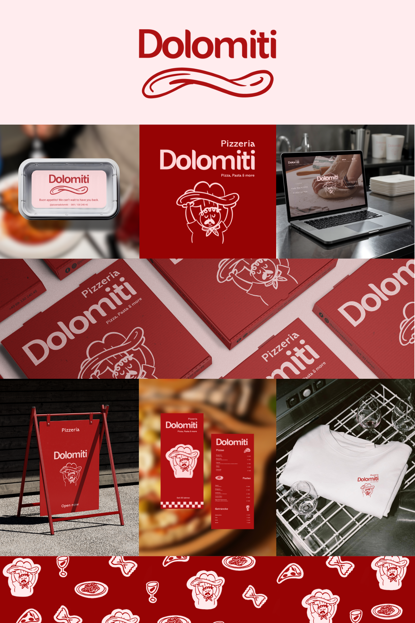 Warm colors, playful shapes, and an expressive pizzaiolo illustration bring the brand to life and reflect the heart of the Dolomiti experience.
