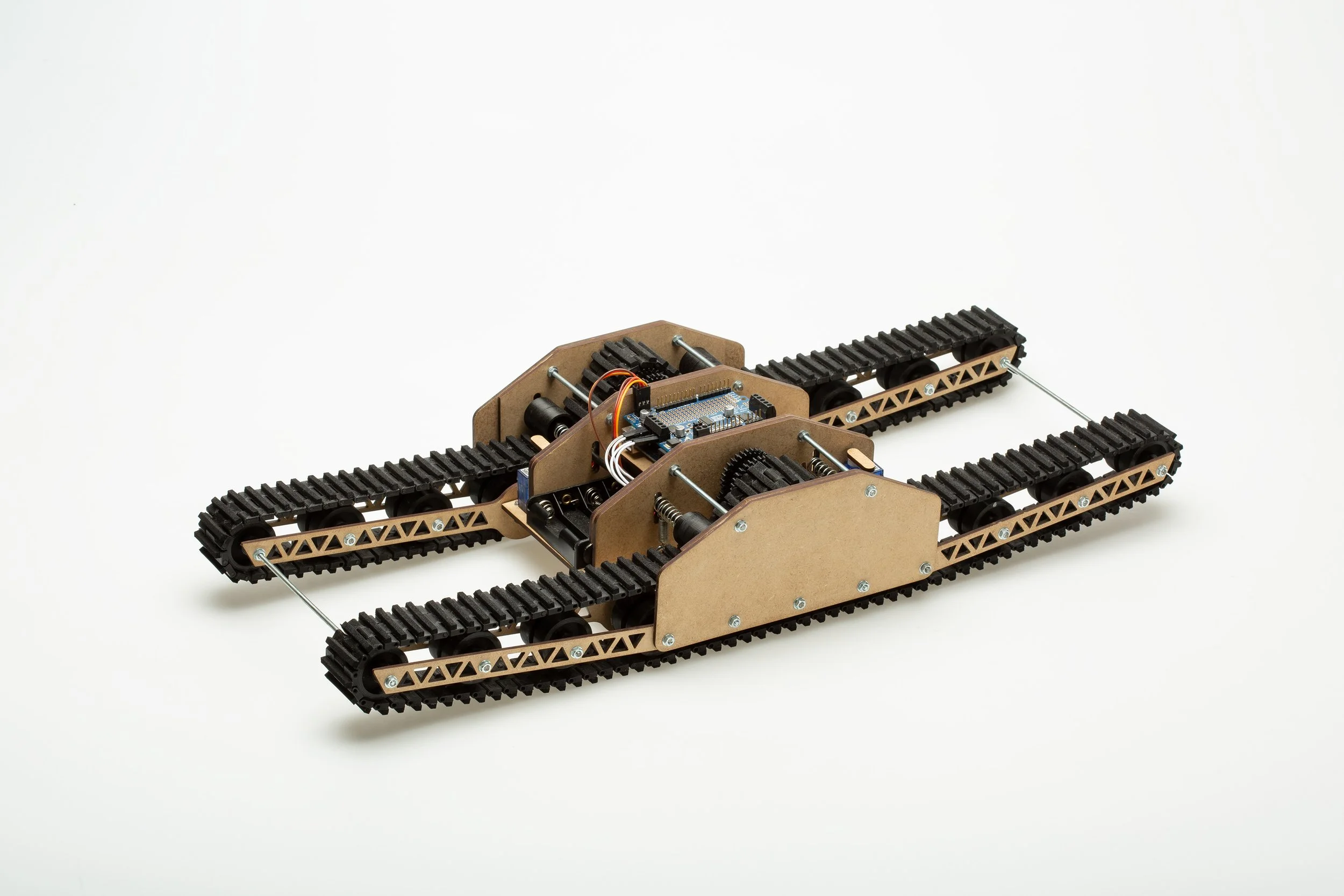 We used a track-based system combined with folding front and rear arms that extended before movement began. A gear-reduction drivetrain was chosen to optimize climbing power and stability across all obstacles.