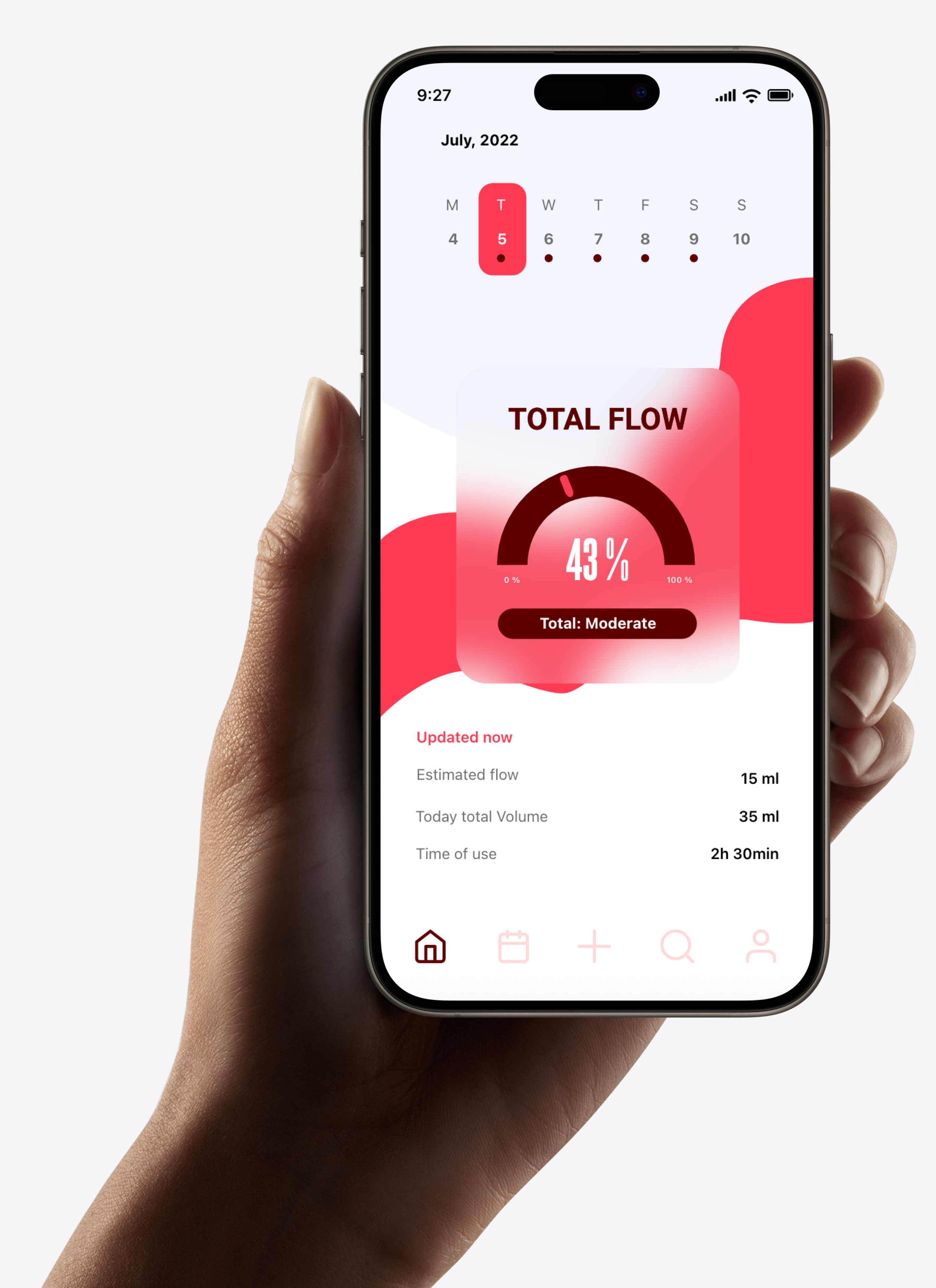 By pairing via Bluetooth, the app translates physical data like flow level into useful, personalized digital feedback, helping users know when to refresh, track daily volume, and monitor their monthly cycle.